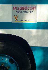 Charlotte and I pounded the superheated streets from the Tsukiji Fish Market, through Ginza, past the Imperial Palace to the Diet (Parliament) Building, where we encountered about 8 police riot buses parked up. Each of them had a notice fixed to the passenger entrance – replete with cute furry animal.